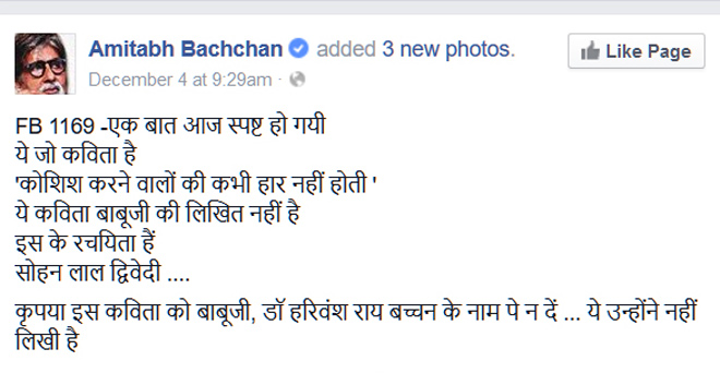 अमिताभ बच्चन ने 3 दिसंबर 2015 को एक ट्विट जारी किया। अमिताभ जी ने स्पष्ट लिखा है, ‘एक बात आज स्पष्ट हो गई, ये कविता है, बाबूजी की लिखित नहीं है। इस के रचयिता सोहन लाल द्विवेदी हैं। कृपया इस कविता को बाबूजी, डॉ हरिवंश राय बच्चन के नाम पर न दें। अमिताभ ने यही अपील फेसबुक पर भी की।