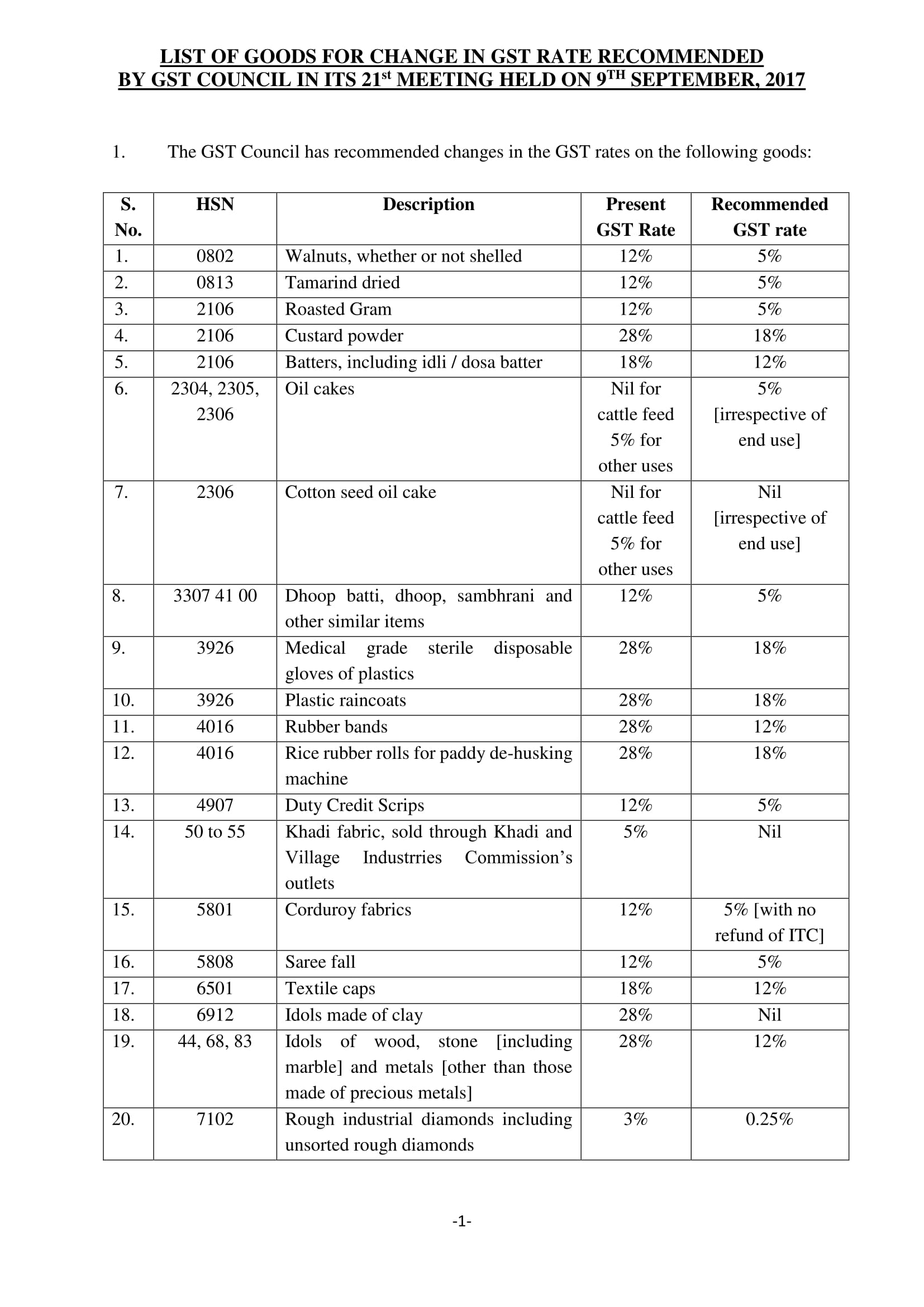 इसके अलावा बैठक में धूप बत्ती, सूखी इमली, प्लास्टिक रेनकोट, रबड़ बैंड, झाड़ू, इडली, डोसा, बटर, खली, भुना चना से लेकर रसोई में काम आने वाले गैस लाइटर जैसे दैनिक उपभोग की 30 वस्तुओं पर जीएसटी दर कम करने का भी फैसला लिया गया। रबड़ बैंड पर जीएसटी दर को घटाकर 12 फीसदी किया गया है। साथ ही बिना ब्रांड वाले खाद्य पदार्थों पर जीएसटी नहीं लगेगा। ब्रांडेड खाद्य पदार्थ पर पांच प्रतिशत जीएसटी लगेगा। उन्होंने कहा कि जिन कंपनियों का अपने उत्पाद के लिए 15 मई, 2017 को ट्रेडमार्क पंजीकृत था, उन्हें पांच प्रतिशत की दर से जीएसटी देना होगा।