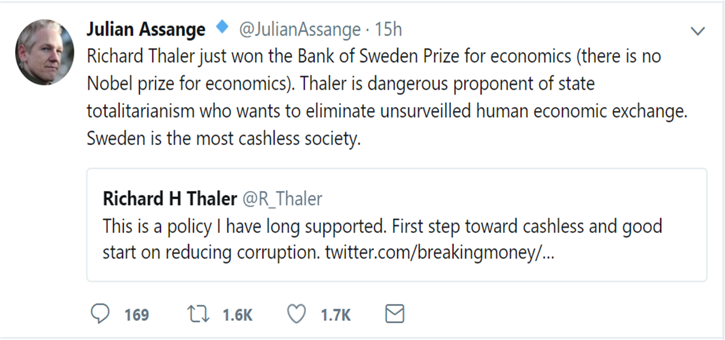 थालेर को लेकर भारत में चल रही बहस में विकिलीक्स के प्रकाशक जूलियन असांजे भी कूद गए। असांजे ने ट्वीट किया है कि थालेर सर्वसत्तावाद राज्य के खतरनाक पैरोकार हैं जो बगैर निगारनी वाले आर्थिक लेन-देन को खत्म करना चाहते हैं। स्वीडन सबसे ज्यादा कैशलेस समाज है। भारत में नोटबंदी के बाद कैशलेस और आधार के जरिए निगरानी को लेकर बहस छिड़ी हुई है।