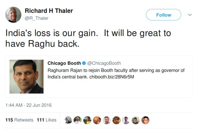 नोटबंदी को लेकर जिन लोगों को आरबीआई के पूर्व गवर्नर रघुराम राजन की आलोचना रास नहीं आती और थालेर का समर्थन अच्छा लग रहा है। उन्हें रघुराम राजन के बार में थालेर के इस ट्ववीट पर भी गौर करना चाहिए। नोबेल पुरस्कार विजेता रघुराम राजन के बारे में क्या सोचता है, इसकी झलक यहां देखी जा सकती है। दोनों शिकागो यूनिवर्सिटी में अर्थशास्त्र पढ़ाते हैं। दोनों ही इस बार नोबेल पुरस्कार की दौड़ में थे।