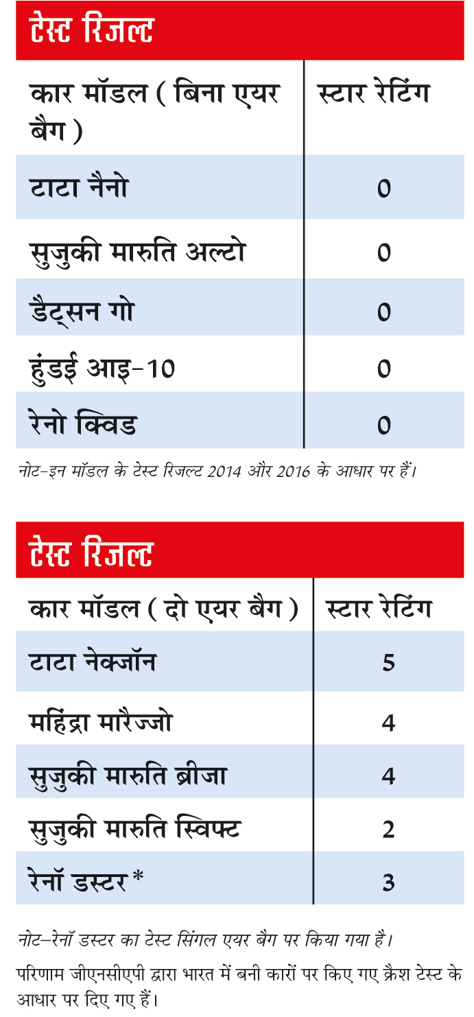 देश में हर साल सरकार में दर्ज आंकड़ों के मुताबिक ही 1.47 लाख से ज्यादा लोग सड़क दुर्घटनाओं में मौत के शिकार हो जाते हैं। उसमें आधे से ज्यादा दोपहिया वाहन, कार, टैक्सी, वैन और हल्के वाहनों की दुर्घटना में असमय मौत के मुंह में चले जाते हैं। अगर वाहनों में एडवांस सेफ्टी फीचर का इस्तेमाल होता, तो कई जानें बच सकती थीं। यह जानकर आश्चर्य होगा कि हमारी सड़कों पर दौड़ रही कारों और दोपहिया वाहनों में सुरक्षा के कई इंतजामात हैं ही नहीं, और हैं भी तो बेहद फिसड्डी। ग्लोबल न्यू कार एसेसमेंट प्रोग्राम के 2014 से 2018 के बीच भारत में बनी कारों के क्रैश टेस्ट कई मायने में आपकी आखें खोल सकते हैं। टेस्ट रिपोर्ट के अनुसार टाटा की नैनो, मारुति सुजुकी की अल्टो, हुंडई की आइ-10, रेनो क्विड और डैट्सन गो जैसी कारों को टेस्ट में जीरो रेटिंग मिली है। ये कारें सुरक्षा के लिहाज से खतरनाक हैं।