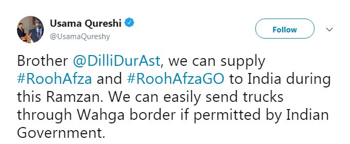 कुरैशी ने अपने ट्वीटर हैंडल में ट्वीट करते हुए लिखा, 'हम रमजान में भारत को रूह अफजा और रूह अफजा गो मुहैया करा सकते हैं। भारत सरकार इजाजत दे तो हम वाघा बॉर्डर के रास्ते से रूह अफजा और रूह अफजा गो ट्रक भेज सकते हैं।'