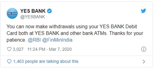 नकदी समस्या से जूझ रहे यस बैंक ने ट्वीट किया, 'अब यस बैंक के खाताधारक अपने डेबिट कार्ड से किसी भी बैंक के एटीएम से निकासी कर सकते हैं।' इस ट्वीट में भारतीय रिजर्व बैंक (आरबीआई) और वित्त मंत्रालय को भी टैग किया गया है।