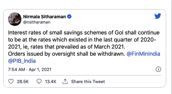 जब गुरूवार को निर्मला सीतारमण ने सफाई देते हुए कहा कि ये गलती से जारी हो गया था तो आम लोगों को हैरानी हुई। वहीं, विपक्ष ने भी लगे हाथ मोदी सरकार को घेरा है। अपने ट्वीट में सीतारमण ने लिखा, केंद्र सरकार की छोटी बचत योजनाओं पर ब्याज दरें वहीं रहेंगी जो वित्त वर्ष 2020-21 के अंतिम चरण में थी। गलती से जारी हुए आदेश को वापस ले लिया गया है।