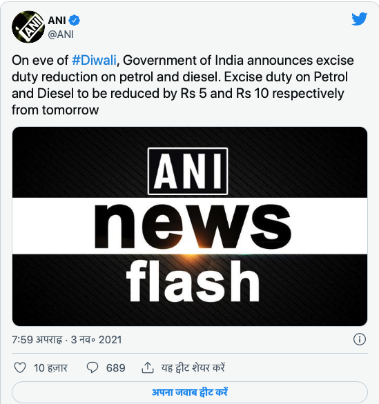 केंद्र सरकार ने त्योहार के मौसम को देखते हुए पेट्रोल-डीजल पर ग्राहकों को बड़ी राहत दी है। केंद्र की मोदी सरकार ने पेट्रोल पर एक्साइज ड्यूटी 5 रुपए और डीजल पर एक्साइज ड्यूटी 10 रुपए कम कर दी है। जिसके बाद अब उम्मीद है कि पहले ही भारी महंगाई की मार से जूझ रहे लोगों को राहत मिल सकता है। तेल की कीमतों में पांच से दस रुपए तक की कमी आ सकती है।