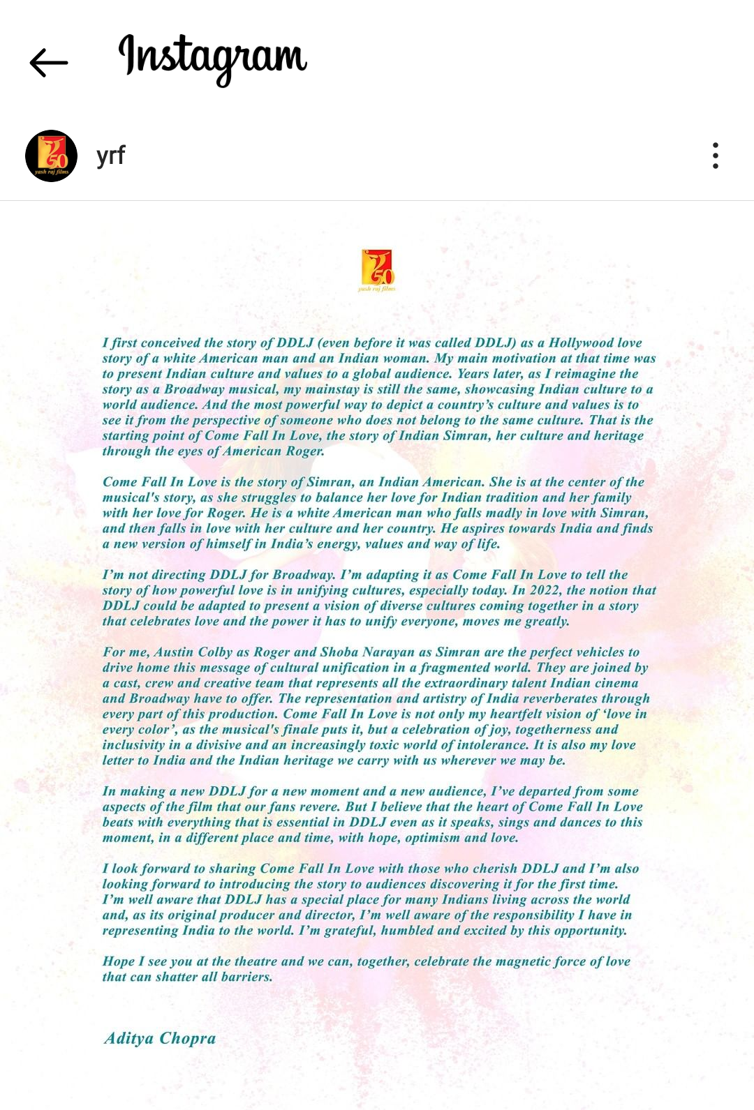 Link : <blockquote class="embedly-card"><h4><a href="https://www.instagram.com/p/ChvHXm-KUId/?igshid=NmNmNjAwNzg=">Yash Raj Films on Instagram: "Aditya Chopra's Broadway-bound musical Come Fall In Love (CFIL) is set to open at The Old Globe, San Diego on September 14. Here's his note inviting people to see a celebration of love on stage... The musical's official Opening is on Wednesday, September 14 and will run through October 16. #ComeFallInLove @theoldglobe"</a></h4><p>Yash Raj Films shared a post on Instagram: "Aditya Chopra's Broadway-bound musical Come Fall In Love (CFIL) is set to open at The Old Globe, San Diego on September 14. Here's his note inviting people to see a celebration of love on stage...</p></blockquote> <script async src="//cdn.embedly.com/widgets/platform.js" charset="UTF-8"></script>