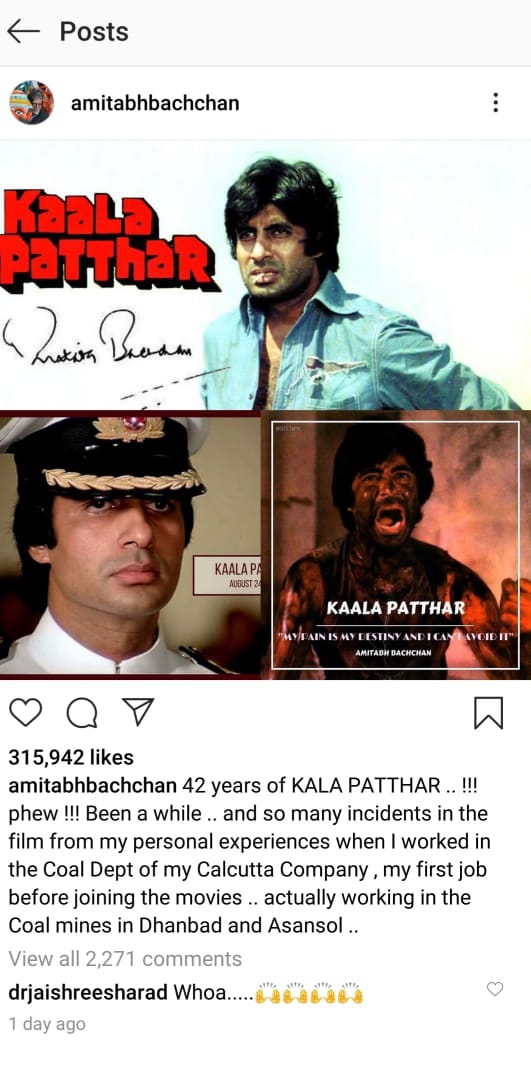 इंस्टाग्राम में खुद और कालापत्थर की तस्वीरें पोस्ट करते हुए लिखा है कि फिल्म की कई घटनाएं मेरे व्यक्तिगत अनुभव से जुड़ी हैं। फिल्मी दुनिया में कदम रखने के पहले जब मैं कोयला डिपार्टमेंट में कोलकाता की कंपनी में वास्तव में धनबाद और आसनसोल के कोयला खदान में काम करता था।