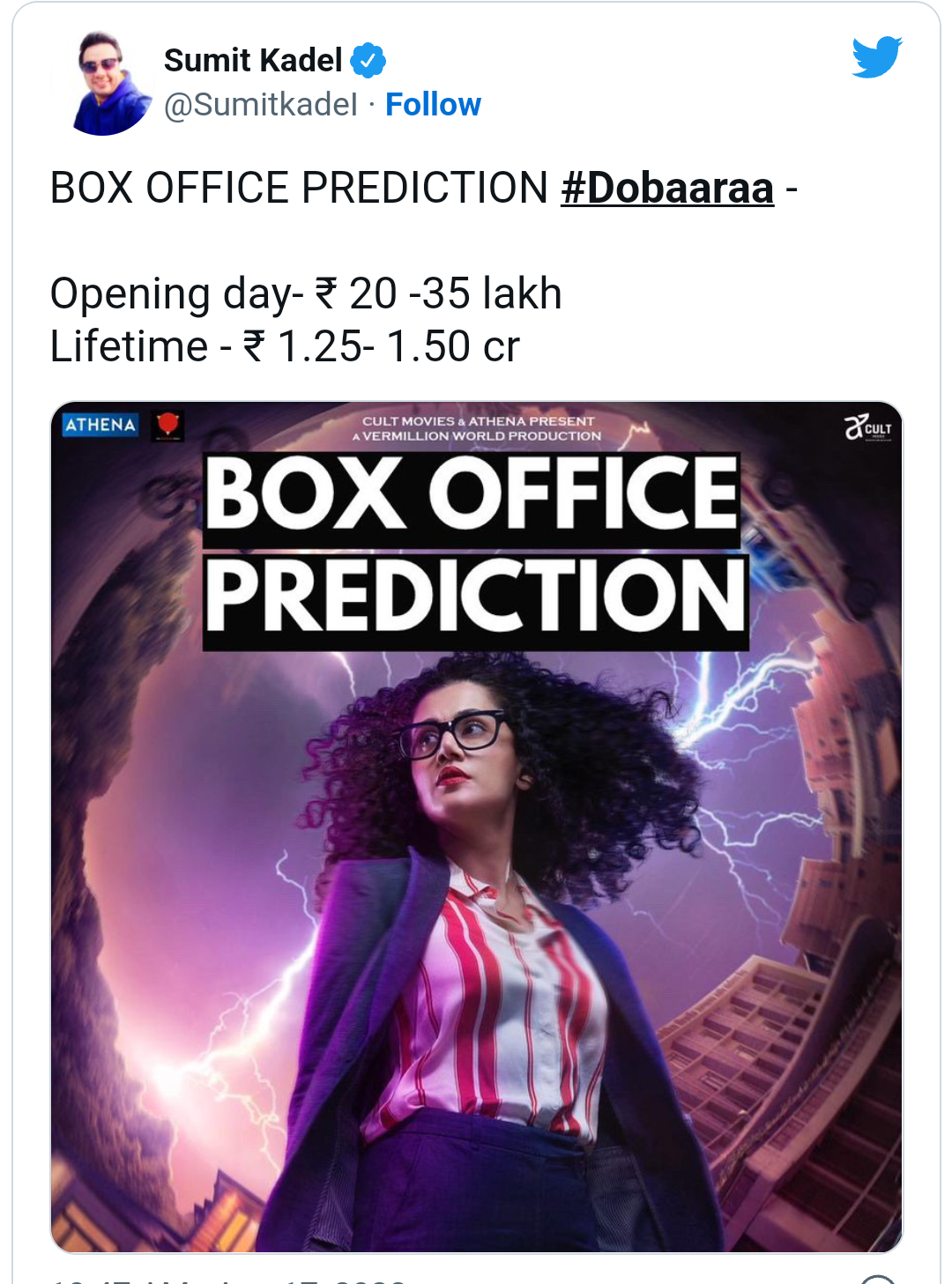 अनुराग कश्यप और तापसी पन्नू ने यह बात मस्ती मजाक के मूड में कही थी लेकिन ऐसा लगता है कि दर्शकों ने उनकी बातें गंभीरता से ले ली हैं। अनुराग कश्यप और तापसी पन्नू की फिल्म "दो बारा" जिन जगहों पर रिलीज हुईं है, उनमें से केवल 2% ऑडियंस की मौजूदगी मिल रही है। अधिकतर शो दर्शक न होने के कारण कैंसल हो रहे हैं। बॉक्स ऑफिस पर फिल्म की शुरुआत बहुत खराब हुई है। पहले दिन फिल्म ने 20 से 30 लाख का कारोबार किया है।