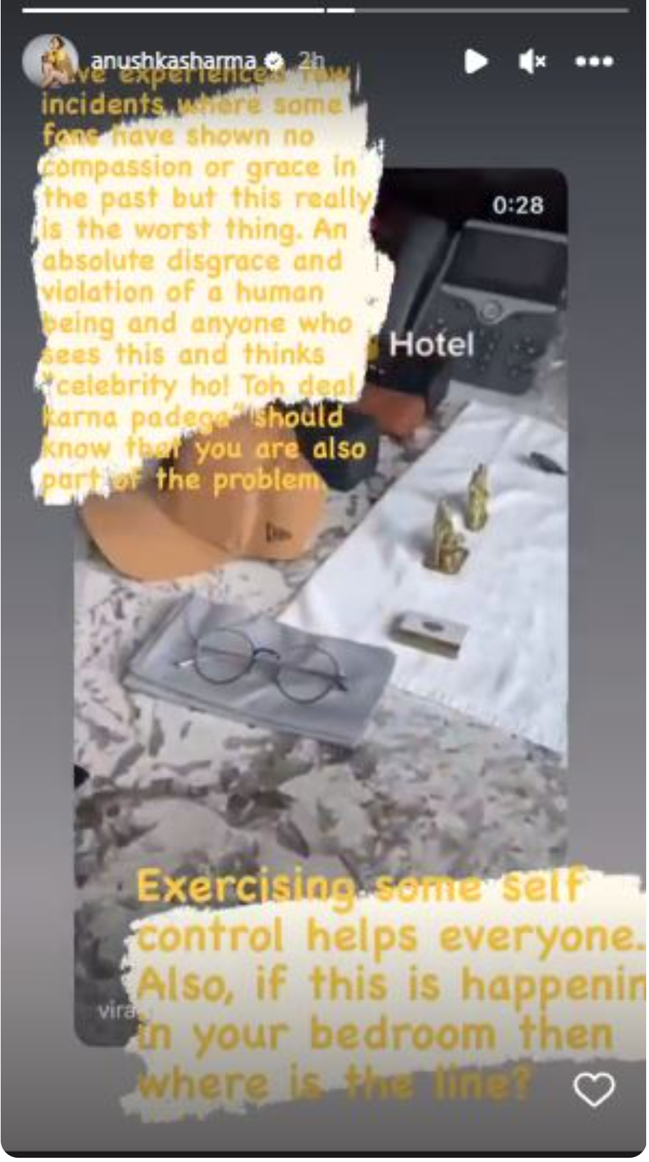 इस पूरे मामले में अनुष्का शर्मा ने इंस्टाग्राम पर पोस्ट साझा की है। उन्होंने लिखा है कि मैंने ऐसे कई उदाहरण देखे हैं, जब अतीत में भी प्रशंसकों ने निजता का उल्लंघन किया है मगर इस बार जो हुआ है, वह उचित नहीं है। यह पूरी तरह से एक इंसान की निजी जिंदगी में अतिक्रमण की तरह है। यदि इस तरह से कोई आपके बेडरूम में दाखिल हो रहा है तो फिर निजता के लिए जगह कहां है, क्या सेलिब्रिटी के कोई अधिकार, कोई जीवन नहीं हैं।