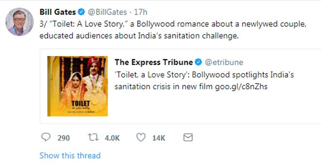 2017 में टॉयलेट एक प्रेम कथा ने बहुत धूम मचाई थी। 62 वर्षीय गेट्स ट्विटर पर 2017 की प्रेरणादाई कहानियों की एक श्रृंखला ट्वीट कर रहे हैं। उन्होंने लिखा कोई इस बात से इनकार नहीं कर सकता कि 2017 कठिन था। लेकिन इसमें भी आशा और उन्नति के कुछ शानदार पल निकले।