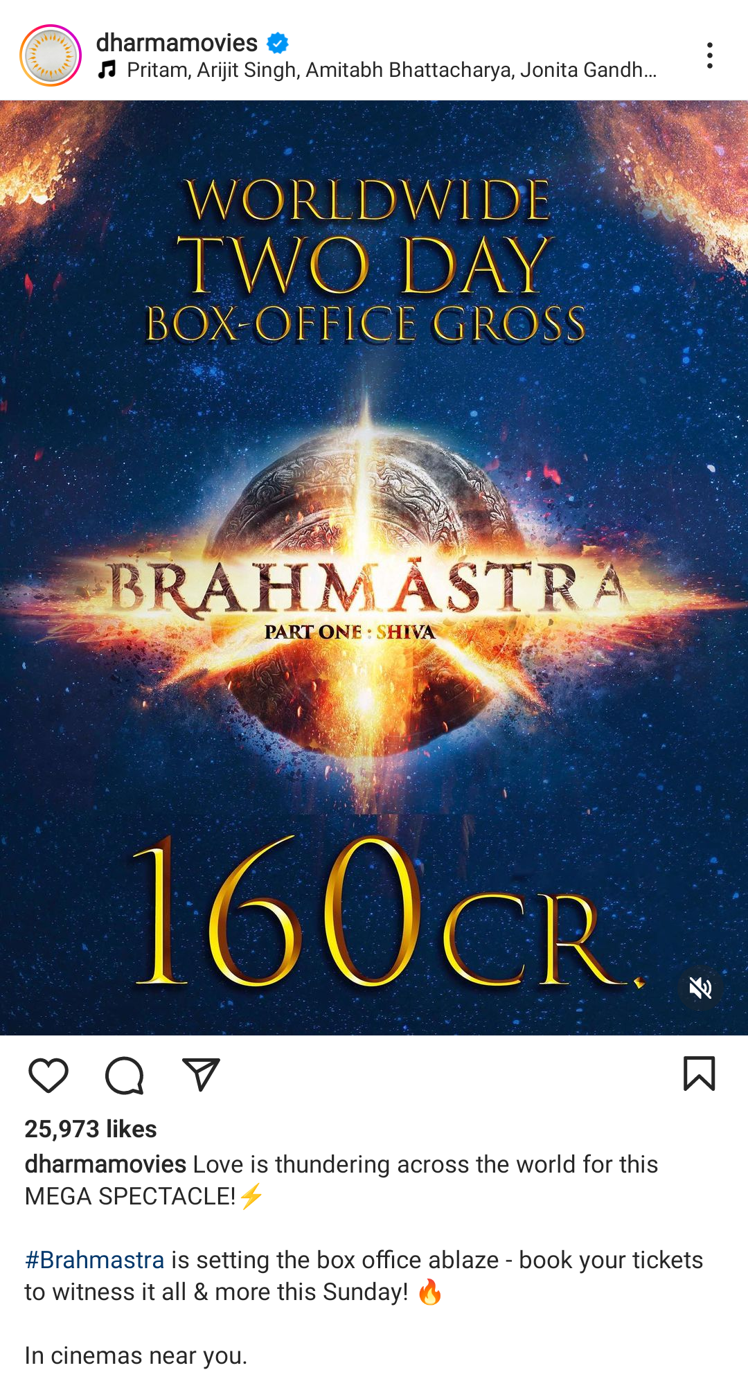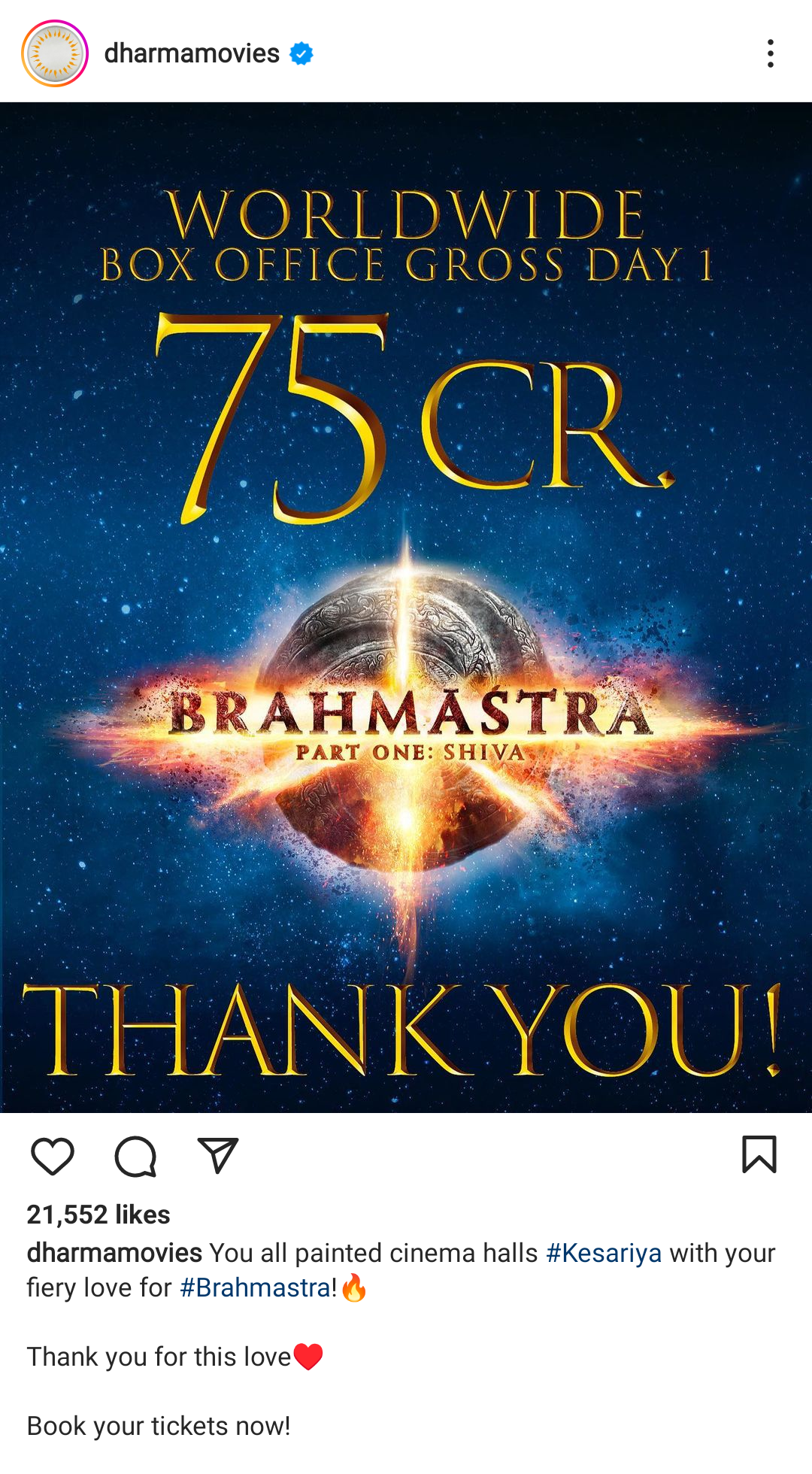 आलिया भट्ट, रणबीर कपूर, अमिताभ बच्चन, नागार्जुन जैसे सितारों से सजी फिल्म "ब्रह्मास्त्र पार्ट वन : शिवा" शुक्रवार को सिनेमाघरों में रिलीज हुई थी। बॉयकॉट बॉलीवुड मुहिम के कारण फिल्म को रिलीज के पहले ही काफी विरोध झेलना पड़ रहा था। इसके चलते फिल्म की सफलता को लेकर आशंकाएं जताई जा रही थीं। मगर जब पहले दिन के कलैक्शन के आंकड़े सामने आया तो वह फिल्म के निर्माताओं के हौसले बढ़ाने वाले थे। ब्रह्मास्त्र के निर्माताओं के अनुसार फिल्म ने भारत में 37 करोड़ का कारोबार किया जबकि विश्वभर में फिल्म की कमाई कुल 75 करोड़ रुपए की हुई थी। भारतीय बॉक्स ऑफिस कलैक्शन और वर्ल्डवाइड कलैक्शन, दोनों ही फिल्म के निर्माताओं की कामयाबी के संकेत देते हैं।