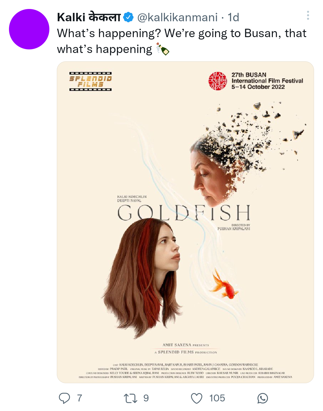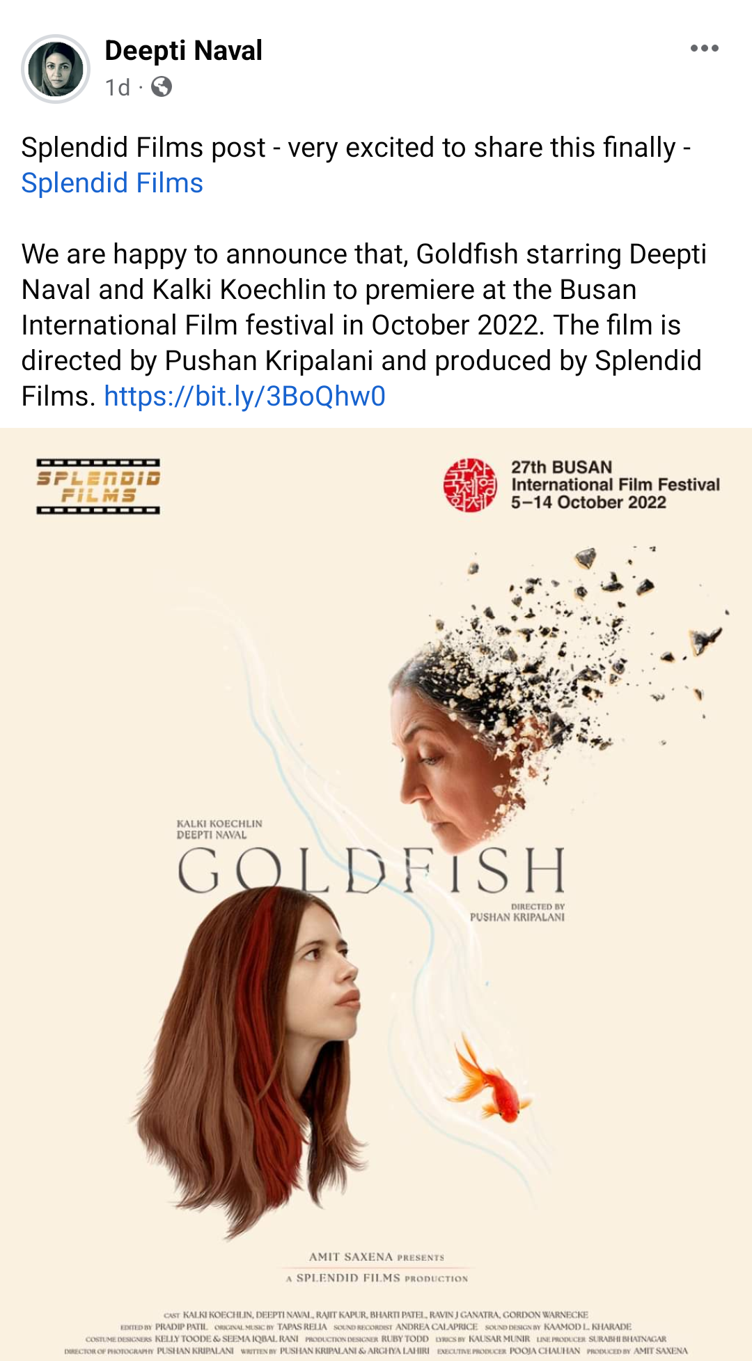 पुषन कृपलानी द्वारा निर्देशित फिल्म 'गोल्डफिश ' में अभिनेत्री दीप्ति नवल के साथ अभिनेत्री कल्कि कोचलिन नजर आएंगी। इसमें दीप्ति नवल मां जबकि कल्कि कोचलिन बेटी के किरदार में दिखाई देंगी। फिल्म के बुसान इंटरनेशनल फिल्म फेस्टिवल में प्रदर्शित होने पर दीप्ति नवल ने प्रसन्नता जाहिर की है।