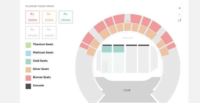 सितारों को करीब से देखने के लिए टिकट की कीमत 40 हजार रुपये है। चालीस हजार की टिकट श्रेणी को टाइटेनियम नाम दिया गया है। तीस हजार रुपये में प्लेटिनम, 25 हजार रुपये में गोल्ड, 15 हजार रुपयों में सिल्वर और 10 रुपयों में ब्रांज श्रेणी के टिकट लिए जा सकते हैं। यदि सितारों को करीब से देखने की चाह है और 40 हजार का सौदा महंगा लग रहा है तो आसान किस्तों में यह सुविधा आपके लिए उपलब्ध है। बुक माय शो वेबसाइट यह सुविधा उपलब्ध है।