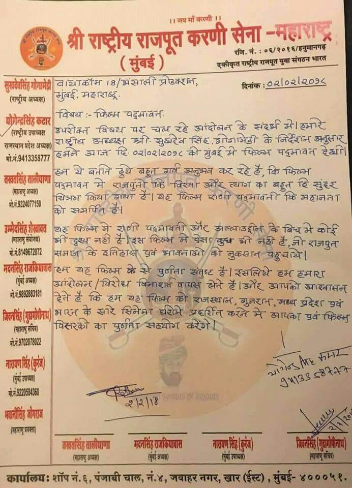 फिल्म देखने के बाद राजपूत करणी सेना ने फिल्म को प्रोड्यूस करने वाली वायकॉम 18 मोशन पिक्चर्स और संजय लीला भंसाली को पत्र लिखकर उनकी साराहना की। फिल्म को लेकर अपनी खुशी व्यक्त करते हुए उन्होंने कहा कि इस फिल्म का बहुत ही सुंदर ढंग से चित्रीकरण किया गया है और साथ ही इसमें रानी पद्मावती और अलाउद्दीन खिलजी का कोई भी सीन नहीं है।