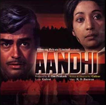 इंदिरा गांधी का नाम आते ही जो पहली फिल्म हर किसी के दिमाग में आती है वो है 1975 में आयी 'आंधी'। गुलज़ार इस फिल्म के डायरेक्टर थे और ऐसा कहा गया कि उन्होंने इंदिरा गांधी के निजी जीवन पर ये फिल्म बनाई है। फिल्म में संजीव कुमार और सुचित्रा सेन थीं। सुचित्रा सेन का लुक फिल्म में इंदिरा गांधी से काफी मिलता जुलता था, इसलिए ऐसी तुलना हुई। इसी वजह से इसे पूरी तरह रिलीज नहीं होने दिया गया था। रिलीज होने के कुछ समय बाद जब इमरजेंसी लगी तो इस फिल्म को बैन झेलना पड़ा। इमरजेंसी ख़त्म होने के बाद जब चुनाव हुए और जनता पार्टी की सरकार बनी तब इससे बैन हटाया गया। फिल्म काफी चर्चा में थी इसलिए दूरदर्शन में इसका प्रीमियर किया गया। फिल्म में आर डी बर्मन का संगीत था जो काफी हिट हुआ।