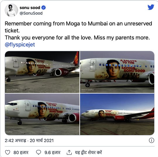 अभिनेता सोनू सूद आजकल हवाई जहाज पर छाए हुए हैं। असल में मामला ये है कि पंजाब के मोगा से मुंबई आ रही फ्लाइट पर स्पाइसजेट ने सोनू सूद को सम्मान देने के लिए प्लेन की बॉडी पर सोनू सूद की तस्वीर लगा दी थी और उस पर लिखा था सोनू को सलाम।