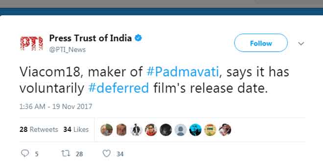 संजय लीला भंसाली की फिल्म ‘पद्मावती’ की रिलीज टल गई है। फिल्म के निर्माता वायकॉम 18 ने कहा है कि अब फिल्म एक दिसंबर को रिलीज नहीं होगी। सेंसर बोर्ड से प्रमाण-पत्र मिलने के बाद रिलीज की नई तारीख की घोषणा की जाएगी।