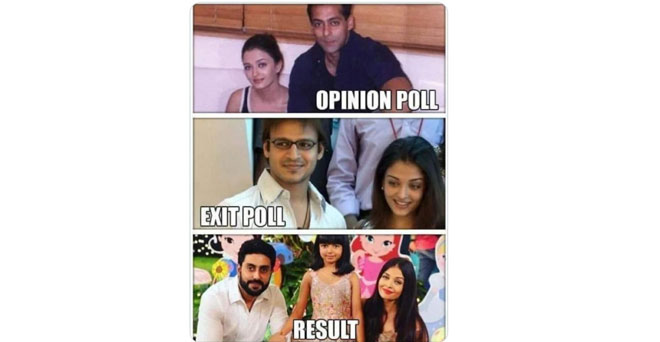 अभिनेता विवेक ओबेरॉय ने एक्जिट पोल को लेकर एक मीम पोस्ट की थी। यह मीम वायरल हो गई और विवेक ओबेरॉय विवादों में आ गए। इस ट्वीट में विवेक ने ऐश्वर्या राय की तस्वीर ट्वीट की थी। पहली तस्वीर में ऐश्वर्या राय-सलमान खान, दूसरी में विवेक ओबेरॉय-ऐश्वर्या राय और तीसरी फोटो में अभिषेक बच्चन और ऐश्वर्या राय को बेटी आराध्या के साथ दिखाया गया था। सलमान की तस्वीर पर ओपिनियन पोल, दूसरी तस्वीर पर एक्जिट पोल और अभिषेक बच्चन के साथ वाली तस्वीर पर रिजल्ट लिखकर इसे एग्जिट पोल से जोड़ गया था।