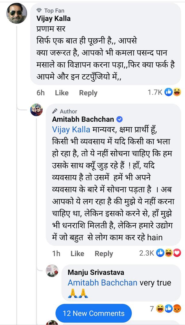 अमिताभ ने फेसबुक पर पोस्ट कर लिखा था- 'एक घड़ी खरीदकर_हाथ में क्या बांध ली, _वक्त पीछे ही_ _पड़ गया मेरे!' इस पोस्ट में एक यूजर ने कमेंट कर लिखा, ‘प्रणाम सर आपसे बस एक बात पूछनी थी, आपको ऐसी भी क्या जरूरत थी कि आपको कमला पसंद के विज्ञापन में आना पड़ा। इसके आगे यूजर ने लिखा कि फिर क्या फर्क रह जाएगा आप में और इन टटपुंजियों में’?? फैन्स के इन प्रश्नों के बाद अमिताभ को अपनी चुप्पी तोड़नी पड़ी।