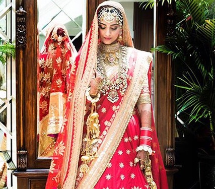 फैशन के अलग अंदाज और अलग-अलग तरह की पोशाकों को लेकर हमेशा चर्चा में रहने वाली सोनम दुल्हन के लाल लिबास में बेहद सुंदर दिख रही थीं। डिजाइनर अनुराधा वकील के डिजाइन किए लहंगा चोली पहने और जेवरों से लदी सोनम एकदम शाही नजर आ रही थीं।