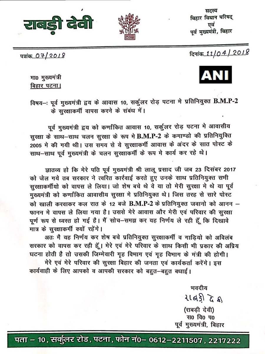 राबड़ी ने लिखा है कि -'ज्ञातव्य हो कि मेरे पति पूर्व मुख्यमंत्री लालू प्रसाद जी जब 23 दिसंबर 2017 को जेल गए तब सरकार ने त्वरित कार्रवाई करते हुए उनके साथ प्रतिनियुक्त सभी सुरक्षाकर्मियों को वापस ले लिया। जो शेष बचे थे वो या तो मेरी सुरक्षा में थे या पूर्व सीएम को कर्णाकित आवासीय सुरक्षा में प्रतिनियुक्त थे। जिस तरह से सारे पोस्ट को खाली करवा कर रात के 12 बजे B.M.P-2 के प्रतिनियुक्त जवानों को आनन-फानन में वापस ले लिया गया है, उससे मेरे आवास और मेरी एवं परिवार की सुरक्षा पूर्ण रूप से ध्वस्त हो गई है। मैं सोच समझ कर निर्णय ले रही हूं कि दिखावे मात्र के सुरक्षाकर्मी क्यों रहेंगे?'