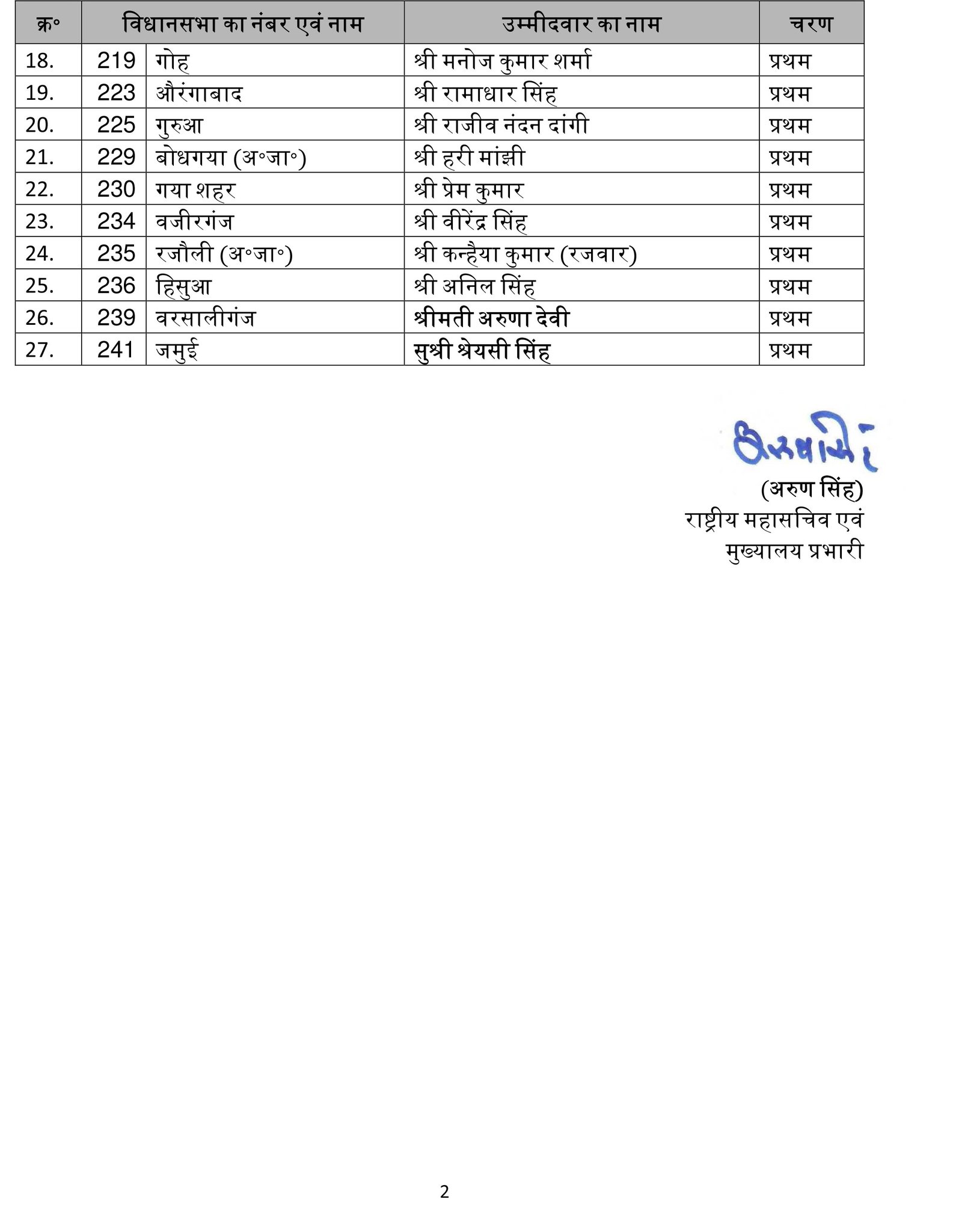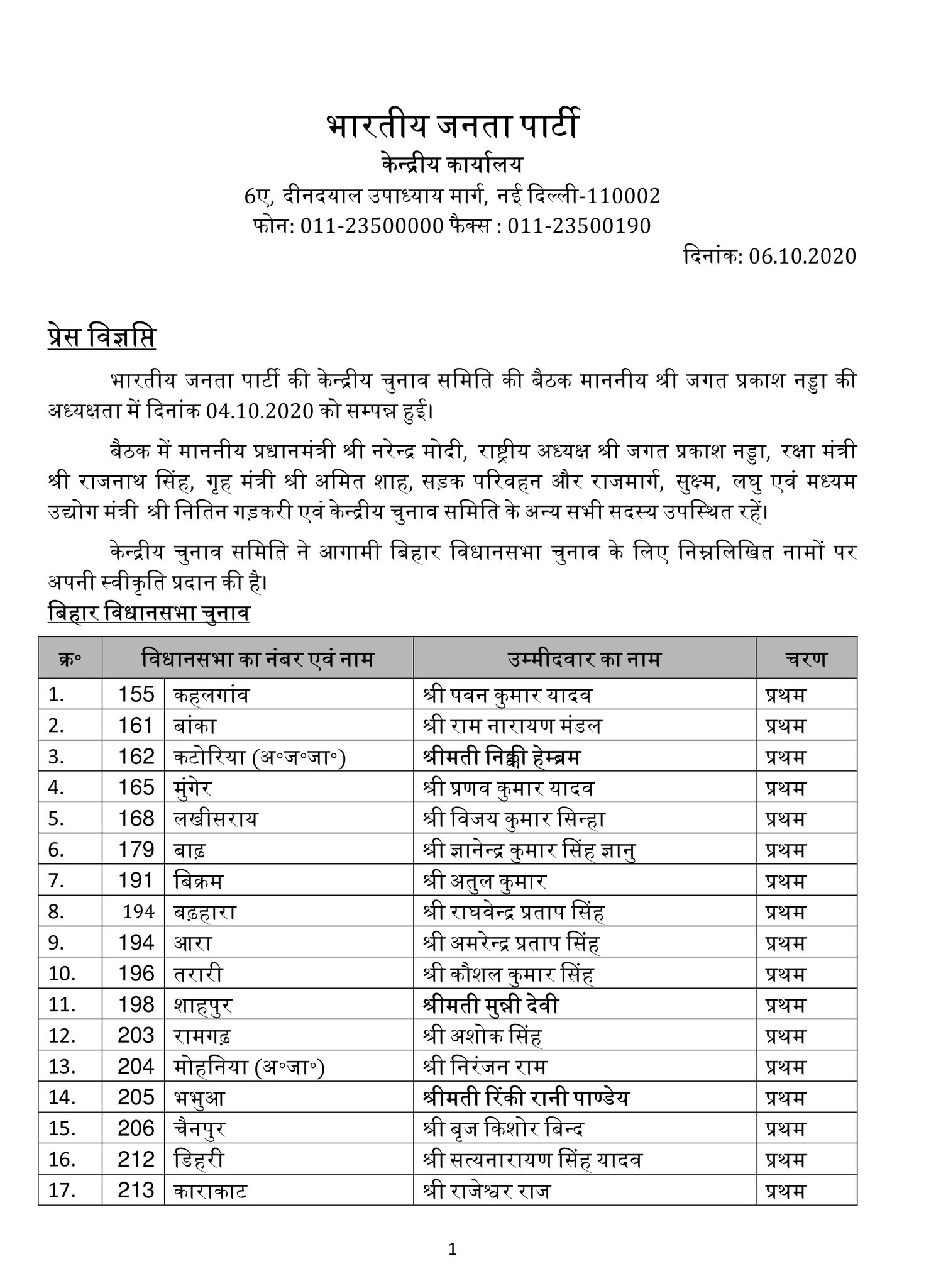 बीजेपी ने उन सीटों के लिए उम्मीदवारों की लिस्ट जारी की है, जहां पर पहले चरण के तहत मतदान होगा।
