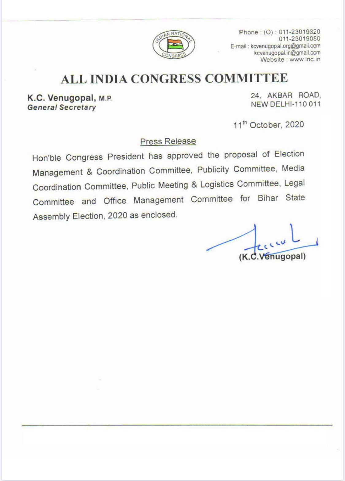 इससे पहले कांग्रेस पार्टी ने शनिवार (10 अक्टूबर) को बिहार विधानसभा चुवाव 2020 के प्रचार में शामिल होने वाले सदस्यों की एक लिस्ट जारी की थी। ये वो सदस्य हैं जो बिहार चुनाव का प्रचार-प्रसार करेंगे। इसमें पूर्व प्रधानमंत्री मनमोहन सिंह, कांग्रेस अध्यक्ष सोनिया गांधी, पूर्व अध्यक्ष राहुल गांधी, महासचिव प्रियंका गांधी वाड्रा, मशहूर अभिनेता शत्रुघ्न सिन्हा और कई अन्य नेता बिहार विधानसभा चुनाव के लिए पार्टी के स्टार प्रचारक होंगे