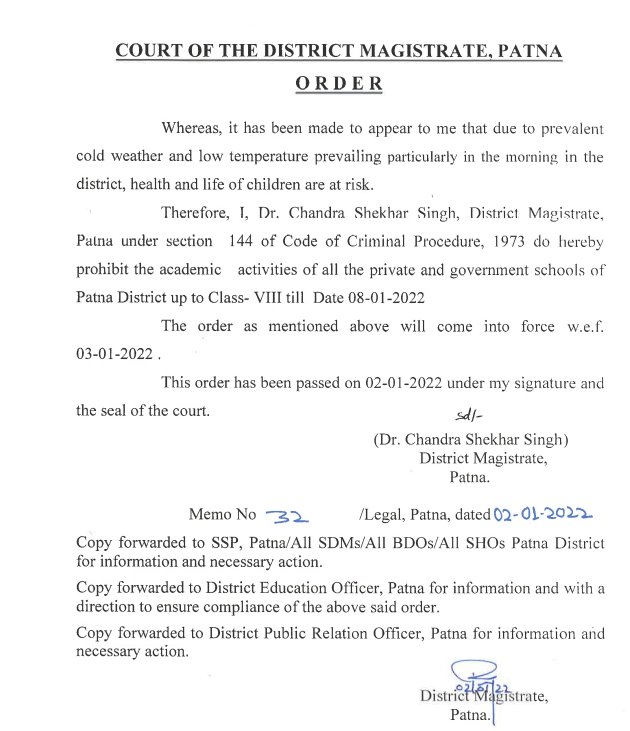 बता दें कि पटना के जिलाधिकारी ने राज्य में भीषण शीतलहर को देखते हुए कक्षा-8 तक सभी सरकारी और निजी स्कूल 8 जनवरी तक बंद रखने की घोषणा की है।
