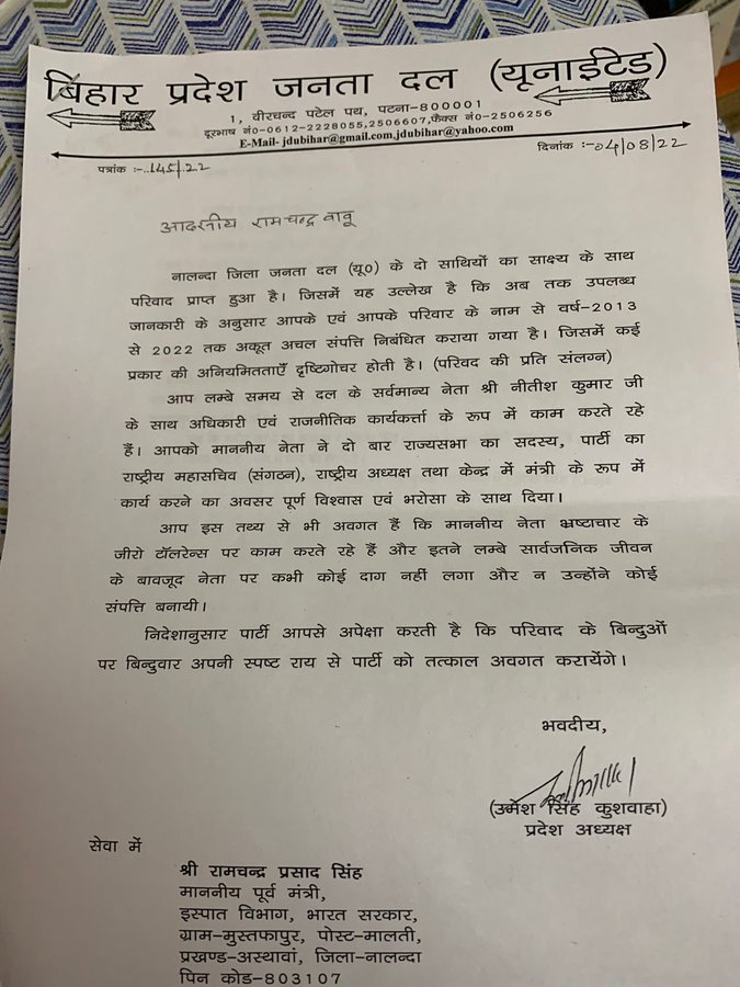 पूर्व केंद्रीय मंत्री रामचंद्र प्रसाद सिंह को यह नोटिस बिहार जदयू अध्यक्ष उमेश सिंह कुशवाहा ने जारी किया है। इसमें कहा गया है कि सिंह और उनके परिवार के नाम पर 2013-2022 से पंजीकृत अचल संपत्तियों के विवरण में विसंगतियां हैं। इसलिए वे जल्द से जल्द इस नोटिस का जवाब दें।