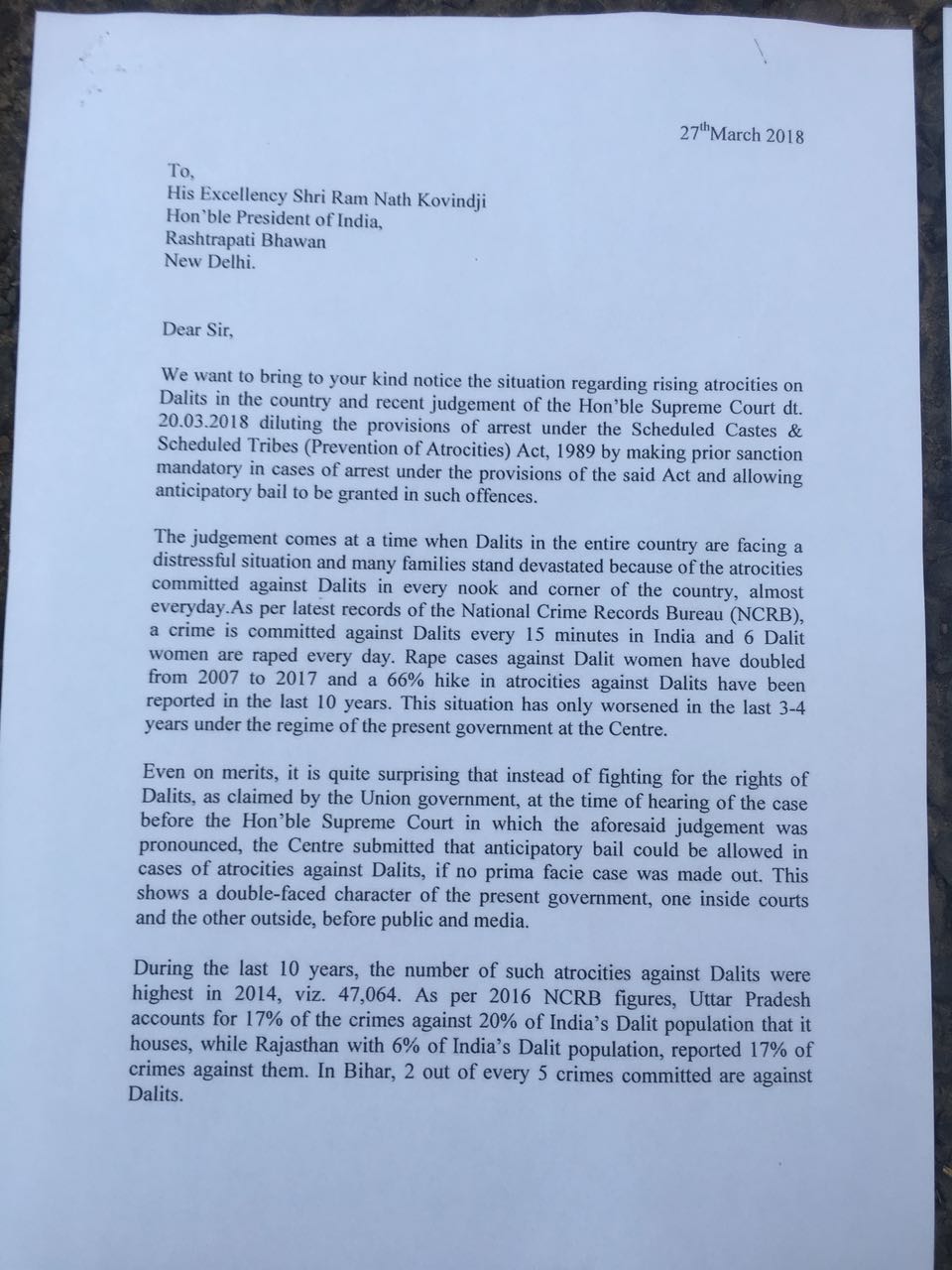 इससे पहले मुलाकात के बारे में कांग्रेस अध्यक्ष राहुल गांधी ने एक ट्वीट कर जानकारी दी थी। राहुल गांधी ने अपने ट्वीट में लिखा था, “पूरे भारत में दलितों और आदिवासियों के खिलाफ बढ़ते अत्याचारों की पृष्ठभूमि में अनुसूचित जाति/अनुसूचित जनजाति अत्याचार अधिनियम में गिरफ्तारी के प्रावधानों को खत्म करने का सुप्रीम कोर्ट का फैसला आया है। विपक्षी दलों के नेता इसको लेकर अपनी चिंताएं साझा करने के लिए आज शाम राष्ट्रपति कोविंद से मुलाकात करेंगे।”