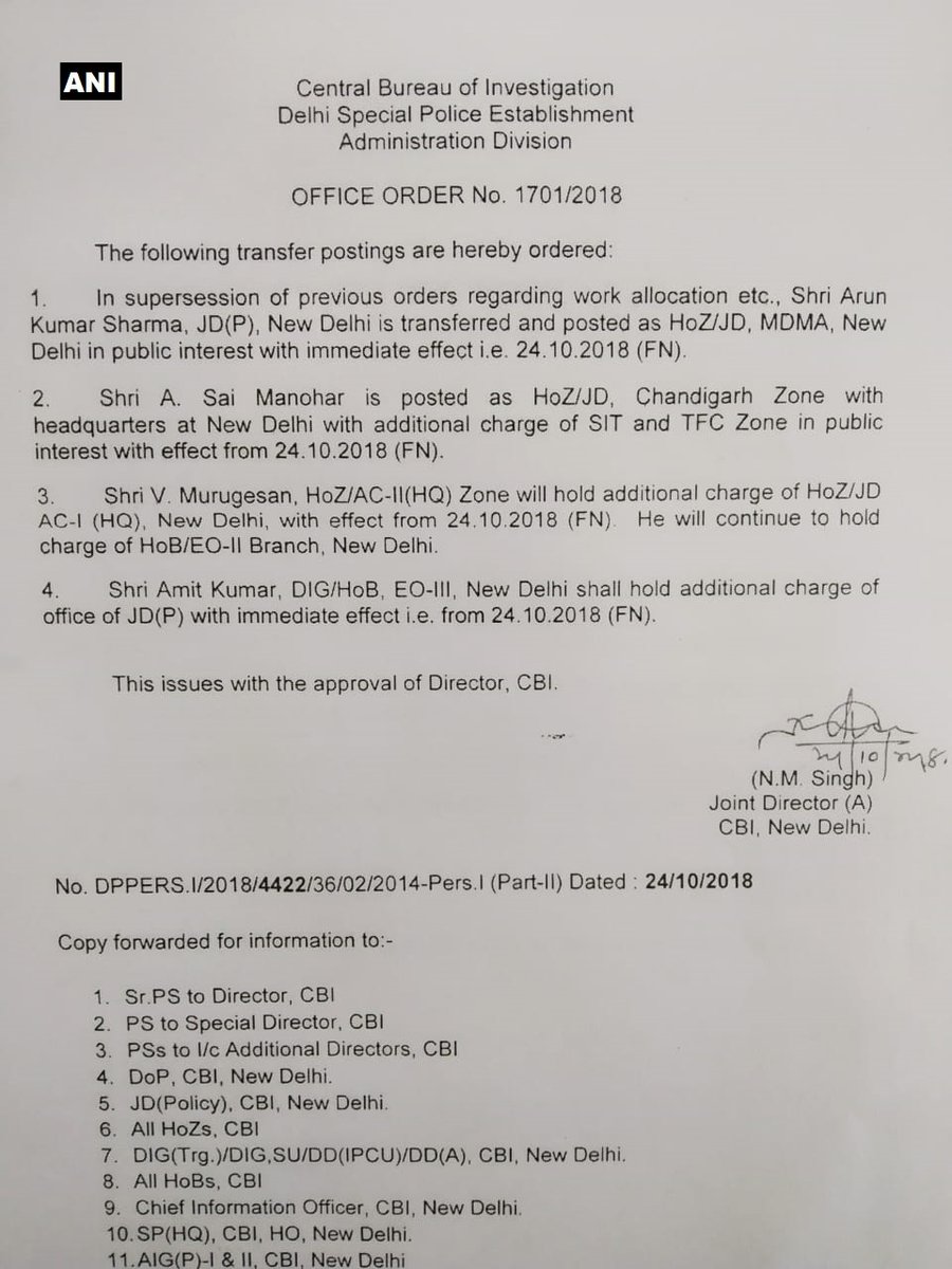 एक सरकारी आदेश में कहा गया कि प्रधानमंत्री की अगुवाई वाली नियुक्ति समिति ने मंगलवार की रात संयुक्त निदेशक एम नागेश्वर राव को तत्काल प्रभाव से सीबीआई निदेशक के पद का प्रभार दिया। इस आदेश का मतलब यह है कि सरकार ने सीबीआई के पदानुक्रम में संयुक्त निदेशक से वरिष्ठ स्तर यानी अतिरिक्त निदेशक रैंक के तीन अधिकारियों को दरकिनार कर नागेश्वर राव को एजेंसी के निदेशक का प्रभार दिया। जिन तीन अतिरिक्त निदेशकों को दरकिनार किया गया है उनमें एके शर्मा भी शामिल हैं। अस्थाना की ओर से की गई शिकायत में शर्मा का नाम सामने आया था।