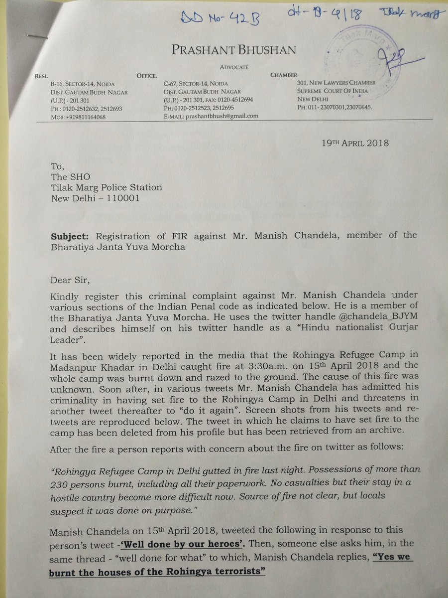 टाइम्स ऑफ इंडिया की रिपोर्ट के मुताबिक, वकील और एक्टिविस्ट प्रशांत भूषण ने शिकायत में कहा है, मनीष चंदेला भारतीय जनता युवा मोर्चा का सदस्य है और उसने अपने ट्वीटर पर कबूल किया है कि उसने मदनपुर खादर स्थित रोहिंग्या शरणार्थी शिविर में आग लगाई थी। आग लगने की यह घटना 15 अप्रैल को रात साढ़े तीन बजे की है जिसमें लगभग सभी झुग्गियां जल गई थीं। मनीष चंदेला ने ट्वीट में आग लगाने की बात कबूली है और फिर से एेसा करने की धमकी दी है।