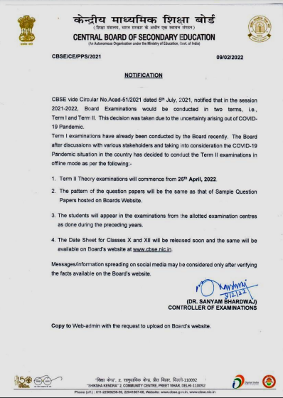 सीबीएसई ने कहा कि 10वीं और 12वीं की परीक्षाओं की डेटशीट जल्द ही ऑफिशियल वेबसाइट cbse.nic.in पर जारी की जाएगी। सीबीएसई के परीक्षा नियंत्रक सनयाम भारद्वाज ने बताया कि बोर्ड ने विभिन्न पक्षों से चर्चा और कोविड-19 की स्थिति को ध्यान में रखते हुए सेकंड टर्म बोर्ड परीक्षा ऑफलाइन मोड में आयोजित करने का फैसला किया है।