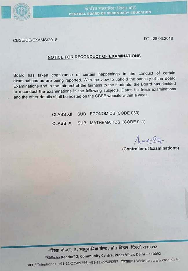 गौरतलब है कि आज जहां एक तरफ छात्र परीक्षा दे रहे थे। वहीं, उससे पहले ये पेपर लीक कर सोशल मीडिया पर डाल दिए गए। खबर फैलने के बाद सीबीएसई ने दोबारा परीक्षा कराने का फैसला किया है। एक हफ्ते के भीतर इन परीक्षाओं की नई तारीखों का ऐलान किया जाएगा।