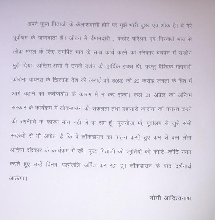 मुख्यमंत्री योगी आदित्यनाथ ने कहा, ‘अंतिम क्षणों में पिता के दर्शन की इच्छा थी, परंतु वैश्विक महामारी कोरोना वायरस के खिलाफ देश की लड़ाई को उत्तर प्रदेश की 23 करोड़ जनता के हित में आगे बढ़ाने के कर्तव्यबोध के कारण मैं नहीं कर सका। कल 21 अप्रैल को अंतिम संस्कार के कार्यक्रम में लॉकडाउन की सफलता और महामारी कोरोना को परास्त करने की रणनीति के कारण भाग नहीं ले पा रहा हूं’।
