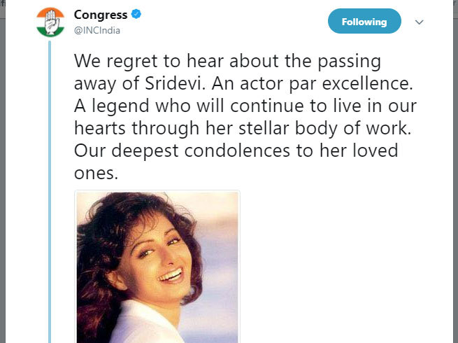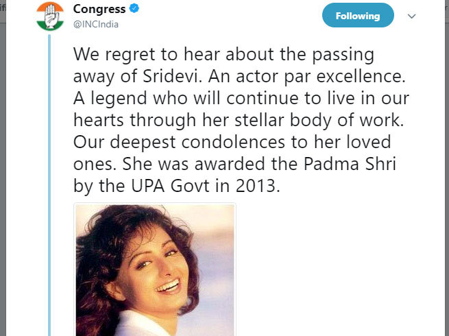 कांग्रेस पार्टी ने ट्वीट कर कहा, 'श्रीदेवी के निधन की खबर सुनकर हमें दु:ख है। वह एक बेहतरीन अदाकारा थीं। दिग्गज अदाकारा जो अपने शानदार अभिनय के कारण वह हमेशा हमारे दिलों में रहेंगी। उनके चाहने वालों के प्रति के हमारी गहरी संवेदना। उन्हें वर्ष 2013 में यूपीए सरकार के कार्यकाल के दौरान पद्म श्री दिया गया था।'