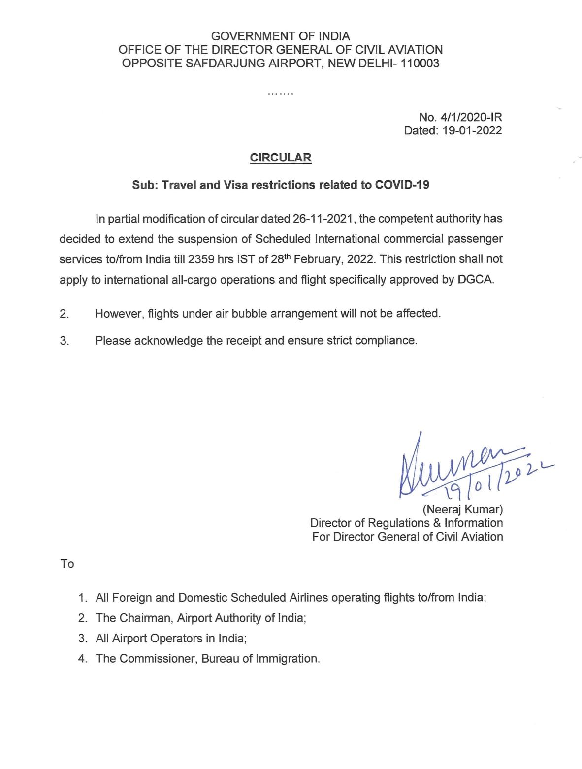 बता दें कि इससे पहले नागर विमानन महानिदेशालय (डीजीसीए) ने 31 जनवरी तक अंतरराष्ट्रीय उड़ान सेवाओं को स्थगित करने का फैसला किया था। भारत आने-जाने वाली सभी अंतरराष्ट्रीय उड़ानें कोविड-19 महामारी के कारण 23 मार्च 2020 से ही बंद हैं। हालांकि पिछले जुलाई 2020 से करीब 28 देशों के साथ हुए एयर बबल समझौते के तहत विशेष अंतरराष्ट्रीय यात्री उड़ानें संचालित हो रही हैं।