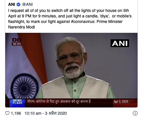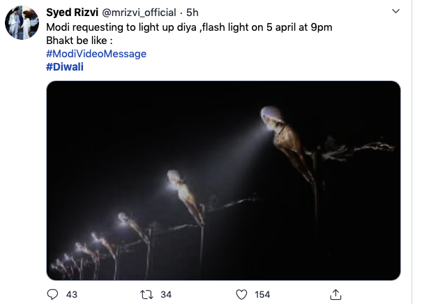 सइद रिजवी नाम के एक ट्विटर यूजर #Diwali और #ModiVideoMessage के साथ लिखते हैं, “मोदी ने दीया जलाने का अनुरोध किया, रात 9 बजे भक्तों के लिए 5 अप्रैल को।”