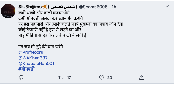 देश में श्रमिकों की खस्ता हालत को लेकर एक अन्य ट्विटर यूजर लिखते हैं, “कभी थाली और ताली बजवाओगे। कभी मोमबत्ती जलवाकर ध्यान भंग करोगे। पर इस महामारी और उसके चलते पनपी भुखमरी का जवाब कौन देगा। कोई तैयारी नहीं है इससे लड़ने की और...मीडिया साहब के तलवे चाटने में लगी है ।”