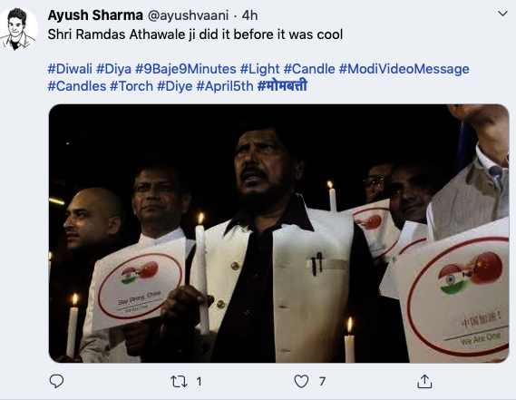 वहीं, पिछले दिनों भाजपा सांसद रामदास अठावले का ‘गो कोरोना गो’ वीडियो काफी वायरल हुआ था। एक यूजर आयुष शर्मा रामदास अठावले और अन्य के हाथ में मोमबत्ती लिए हुए ट्वीट करते हैं, “श्री रामदास अठावले जी, इसके ठंडे होने से पहले यह कर डालें।"