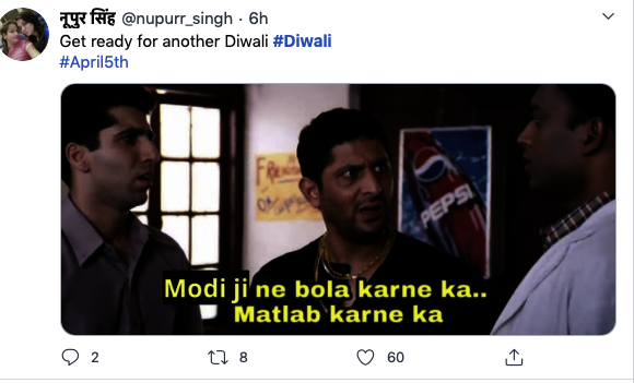 एक अन्य नुपुर सिंह नाम की यूजर एक्टर अरशद वारसी के मिम के साथ ट्वीट करती हैं, "5 अप्रैल को दूसरे दिवाली के लिए तैयार हो जाओ।"