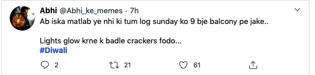 इसी बात को जोड़ते हुए एक यूजर अभी लिखते हैं, "अभी इसका मतलब ये नहीं कि हम लोग संडे को नौ बजे बालकनी पे जाके लाइट जलाने के बदले पटाखें फोड़ो।"