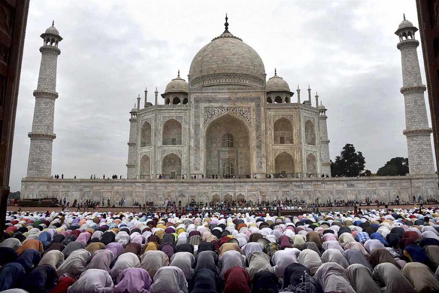 ईद-उल-अजहा के मौके पर आगरा में ताजमहल के निकट शाही मस्जिद में इबादत करते लोग..