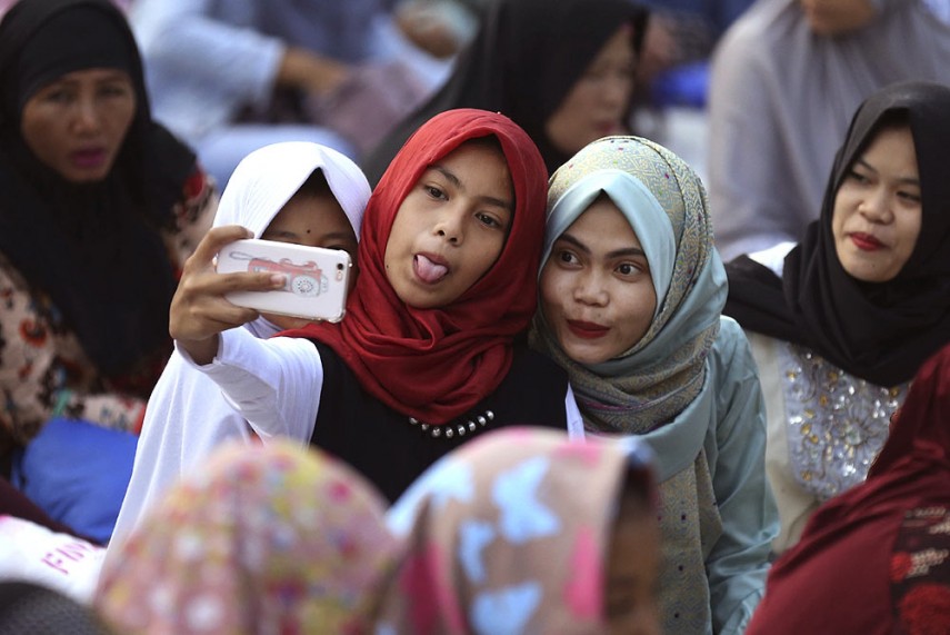 जकार्ता, इंडोनेशिया में ईद की सुबह प्रार्थना के बाद सेल्फी लेती मुस्लिम लड़कियां