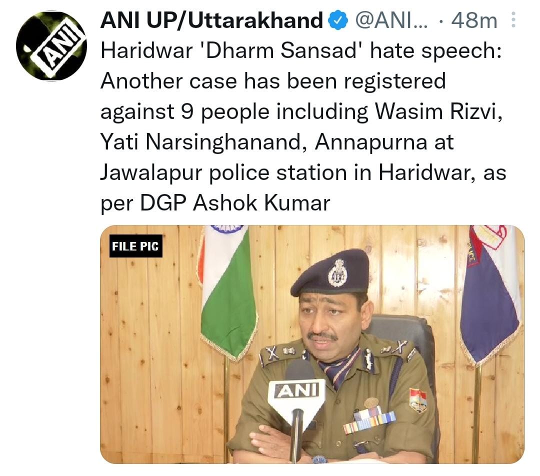 अब इस हेट स्पीच के मामले में पुलिस सक्रिय हो गयी है। डीजीपी अशोक कुमार के अनुसार हरिद्वार के ज्वालापुर थाने में वसीम रिजवी, यति नरसिंहानंद, अन्नपूर्णा समेत 9 लोगों के खिलाफ एक और मामला दर्ज किया गया है।