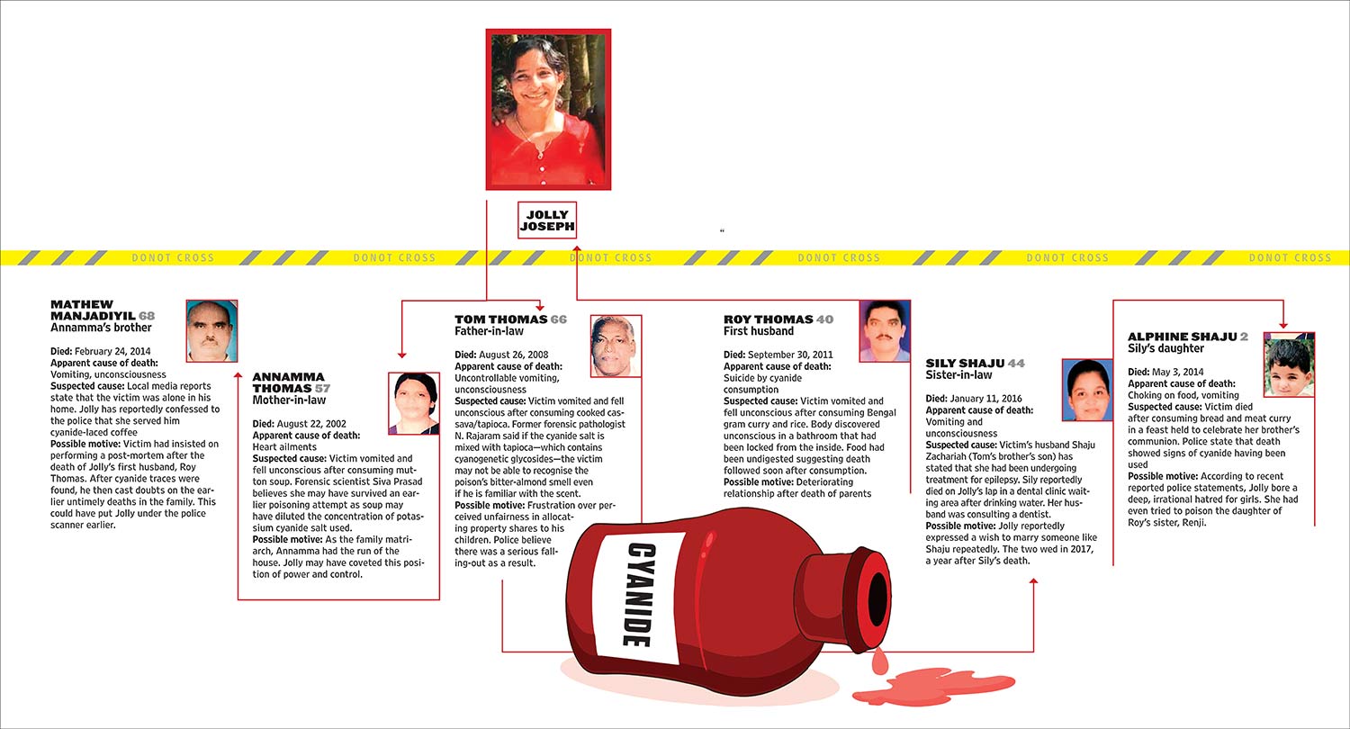 6 मौतों में से 2002 में जहर खाने से मरने वाली पहली महिला 57 वर्षीय महिला अनाम्मा थॉमस जो कि आरोपी की सास थी। 2008 में, अनाम्मा के पति यानी ससुर टॉम थॉमस का भी इसी तरह रहस्यमई परिस्थितियों में निधन हो गया। तीन साल बाद, आरोपी जॉली अम्मा जोसेफ के पति रॉय थॉमस की भी मृत्यु हो गई और 2014 में अन्नामामा के भाइयों ने भी कुछ इसी तरह अंतिम सांस ली। 2014 में ही एक ही परिवार के दो साल के बच्चे की मौत उसी संदिग्ध परिस्थितियों में हुई। इसके बाद 2016 में उस बच्चे की मां की मौत हुई। परिवार के अंदर 14 साल की अवधि में 6 मौतें देखने को मिलीं।