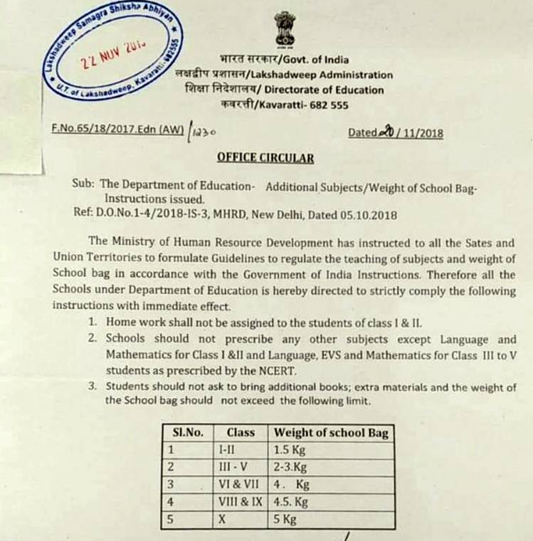 मानव संसाधन विकास मंत्रालय ने सोमवार को एक सर्कुलर जारी करते हुए स्कूल बैग के वजन व पाठ्यक्रम को लेकर स्पष्ट निर्देश जारी किए हैं। मंत्रालय ने सभी राज्यों और केंद्र शासित राज्यों को कहा है कि अब बच्चों के बैग का वजन वही होगा जो मिनिस्ट्री की ओर से तय किया जाएगा। गाइनलाइन में कक्षाओं के मुताबिक बच्चों के स्कूल बैग का वजन निर्धारित कर दिया गया है।