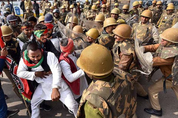 - प्रयागराज में नागरिकता (संशोधन) अधिनियम के विरोध में प्रदर्शन कर रहे समाजवादी पार्टी के कार्यकर्ताओं को हिरासत में लेते पुलिसकर्मी।