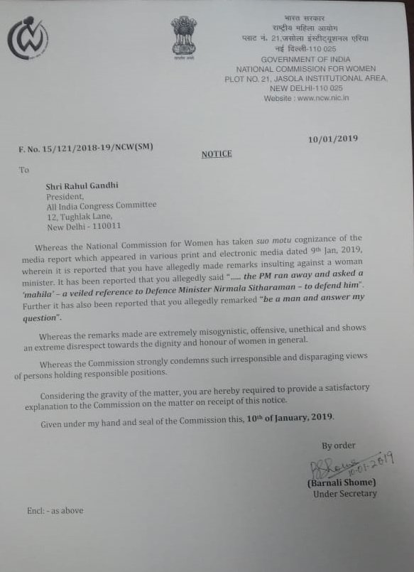 इससे पहले राष्ट्रीय महिला आयोग की अध्यक्ष रेखा शर्मा ने ट्वीट किया था कि राहुल गांधी का बयान 'एक महिला से कहा मेरी रक्षा कीजिए?' महिला विरोधी है। क्या वह सोचते हैं कि एक महिला कमजोर है? राहुल गांधी देश की रक्षा मंत्री को ही कमजोर बता रहे हैं। जिसके बाद राष्ट्रीय महिला आयोग ने कांग्रेस अध्यक्ष राहुल गांधी को नोटिस भेजा।