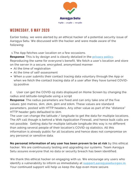 हैकर ने ट्विटर के जरिए आरोग्य सेतु टीम से कहा था कि आपके ऐप में सिक्योरिटी का इश्यू है। 9 करोड़ लोगों की प्राइवेसी को खतरा है। क्या आप मुझसे अलग से बात कर सकते हैं? हैकर ने ये भी कहा कि राहुल गांधी सही थे। ऐसा इसलिए कहा क्योंकि, कांग्रेस नेता राहुल गांधी ने कुछ दिन पहले आरोग्य सेतु ऐप में डेटा की सुरक्षा का सवाल उठाया था।